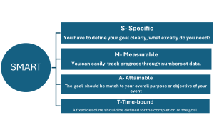 Event planning starts well only when you are clear about the purpose of your event. You have to decide whether you want brand promotion, lead generation, building a community, or only celebrating something. After that, you focus on the target audience and set SMART goals, which are :